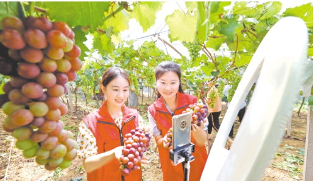 8月6日,在山東省棗莊市市中區(qū)稅郭鎮(zhèn)沙溝村葡萄園,青年志愿者通過網(wǎng)絡(luò)直播幫助農(nóng)民銷售葡萄。